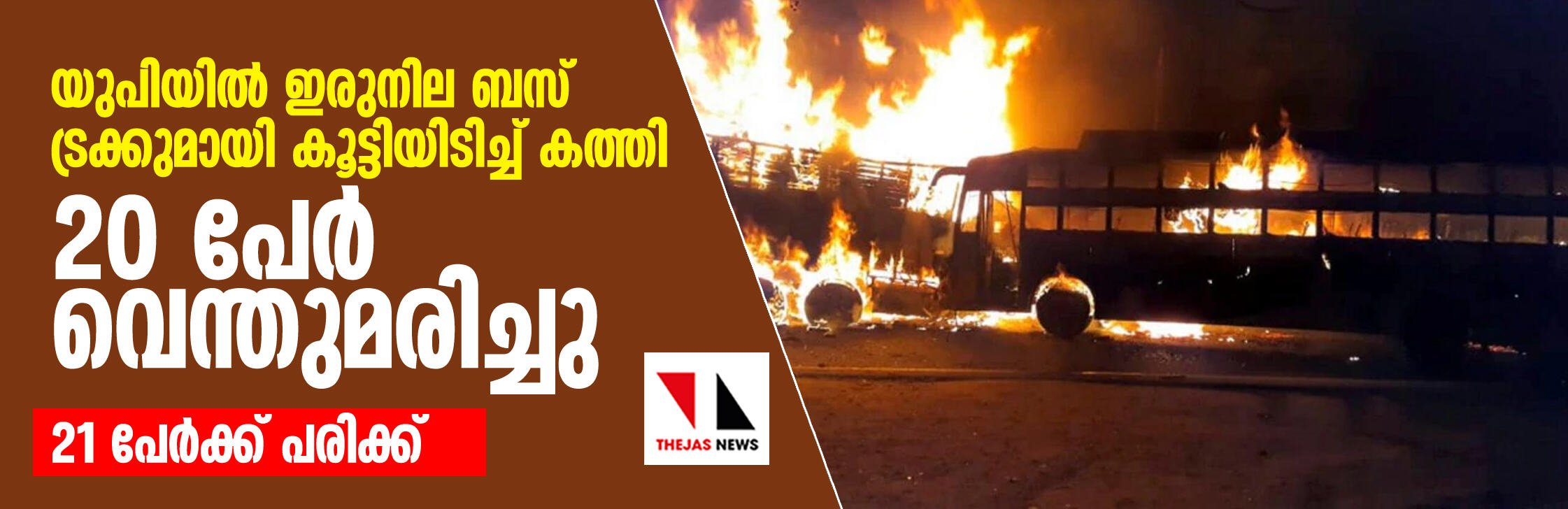 യുപിയില് ഇരുനില ബസ് ട്രക്കുമായി കൂട്ടിയിടിച്ച് കത്തി; 20 പേര് വെന്തുമരിച്ചു, 21 പേര്ക്ക് പരിക്ക്