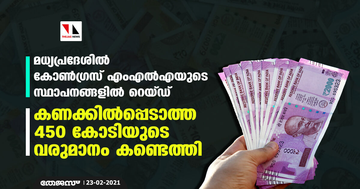 മധ്യപ്രദേശില് കോണ്ഗ്രസ് എംഎല്എയുടെ സ്ഥാപനങ്ങളില് റെയ്ഡ്; കണക്കില്പ്പെടാത്ത 450 കോടിയുടെ വരുമാനം കണ്ടെത്തി