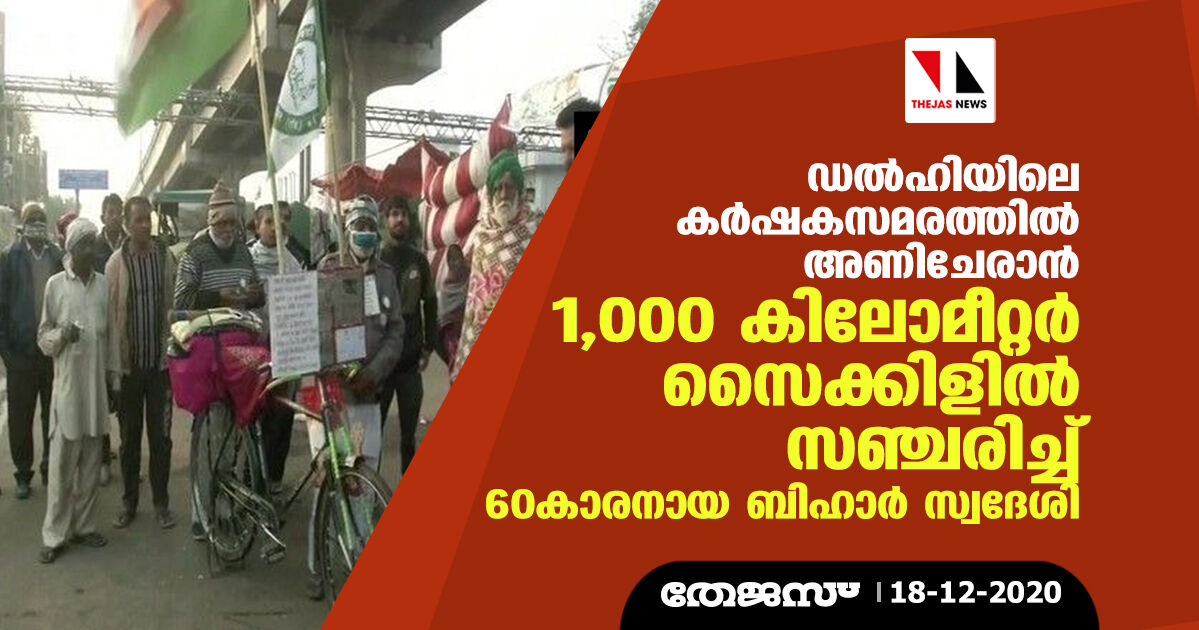 ഡല്ഹിയിലെ കര്ഷകസമരത്തില് അണിചേരാന് 1,000 കിലോമീറ്റര് സൈക്കിളില് സഞ്ചരിച്ച് 60കാരനായ ബിഹാര് സ്വദേശി