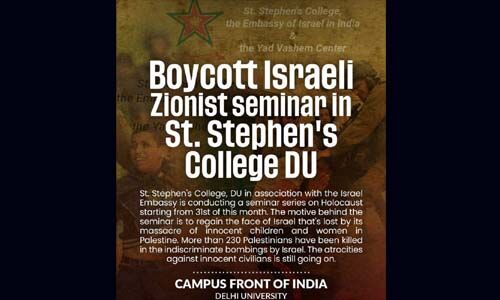 ഡല്ഹിയിലെ സെന്റ് സ്റ്റീഫന്സ് കോളജിലെ ഇസ്രായേലി സയണിസ്റ്റ് സെമിനാര് ബഹിഷ്കരിക്കണമെന്ന് കാംപസ് ഫ്രണ്ട് ഓഫ് ഇന്ത്യ ഡല്ഹി സര്വകലാശാല യൂനിറ്റ് ആഹ്വാനം ചെയ്തു. ഫലസ്തീനിലെ നിരപരാധികളായ കുട്ടികളെയും സ്ത്രീകളെയും കൂട്ടക്കൊല ചെയ്തതിലൂടെ നഷ്ടപ്പെട്ട ഇസ്രായേലിന്റെ മുഖം വീണ്ടെടുക്കുകയെന്നതാണ് സെമിനാറിന്റെ പിന്നിലെ ലക്ഷ്യം. ഇസ്രായേല് നടത്തിയ വിവേചനരഹിതമായ ബോംബാക്രമണത്തില് 230 ലധികം ഫലസ്തീനികള് കൊല്ലപ്പെട്ടു. നിരപരാധികളായ സാധാരണക്കാര്ക്കെതിരായ അതിക്രമങ്ങള് ഇപ്പോഴും തുടരുകയാണ്.