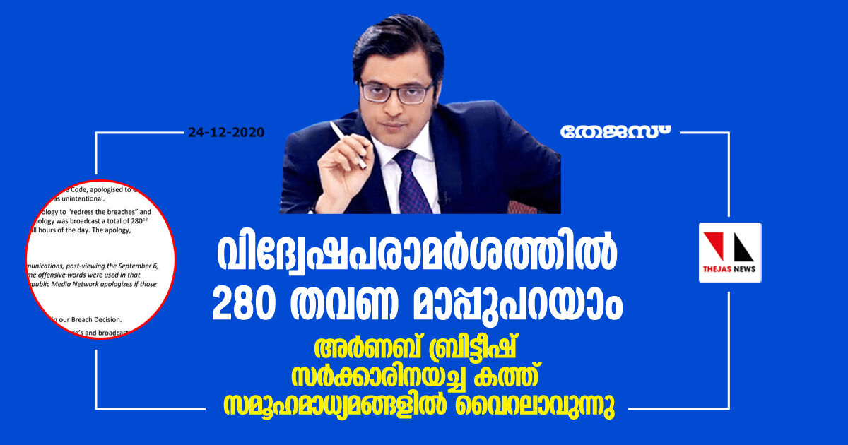 വിദ്വേഷപരാമര്ശത്തില് 280 തവണ മാപ്പുപറയാം; അര്ണബ് ബ്രിട്ടീഷ് സര്ക്കാരിനയച്ച കത്ത് സമൂഹമാധ്യമങ്ങളില് വൈറലാവുന്നു