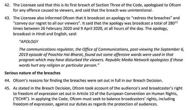 ആദ്യമായാണ് ചാനലിന്റെ ഭാഗത്തുനിന്ന് ഇത്തരത്തില് ഒരു നിയമലംഘനം സംഭവിക്കുന്നത്. ആദ്യം ഓഫ്കോമിനോട് ക്ഷമാപണം നടത്തുന്ന ചാനല്, പ്രശ്നങ്ങള്ക്ക് പരിഹാരം കാണാന് പ്രേക്ഷകരോട് 280 തവണ മാപ്പുപറയാന് തയ്യാറാണ്. 2020 ഫെബ്രുവരി 26നും ഏപ്രില് 9നും ഇടയിലായി 280 തവണ തങ്ങളുടെ ക്ഷമാപണം ചാനലില് സംപ്രേക്ഷണം ചെയ്യുമെന്നാണ് റിപബ്ലിക് ഭാരത് പറയുന്നത്. അര്ണബ് ഗോ സ്വാമിയുടെ ഉടമസ്ഥതയിലുള്ള റിപബ്ലിക് ടിവിയുടെ ഹിന്ദി ചാനലാണ് റിപബ്ലിക് ഭാരത്. 2019ല് അര്ണബ് ഗോസ്വാമി അവതരിപ്പിച്ച പൂച്ഛാ ഹേ ഭാരത് എന്ന പരിപാടിയില് അവതാരകനും അതിഥികളും സംപ്രേക്ഷണ നിയമങ്ങള് ലംഘിച്ചെവന്നാരോപിച്ച് യുകെ ബ്രോഡ്കാസ്റ്റിങ് റെഗുലേറ്ററായ ഓഫ്കോം 20,000 പൗണ്ട് (20 ലക്ഷം രൂപ) പിഴ ചുമത്തുകയായിരുന്നു.