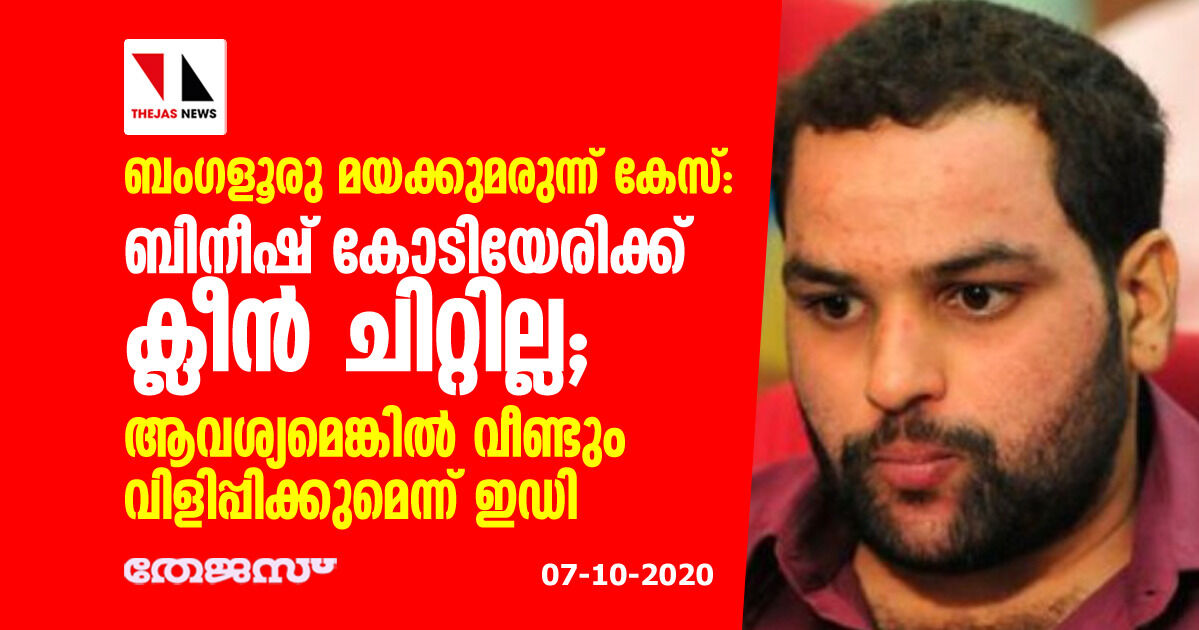ബംഗളൂരു മയക്കുമരുന്ന് കേസ്: ബിനീഷ് കോടിയേരിക്ക് ക്ലീന് ചിറ്റില്ല; ആവശ്യമെങ്കില് വീണ്ടും വിളിപ്പിക്കുമെന്ന് ഇഡി
