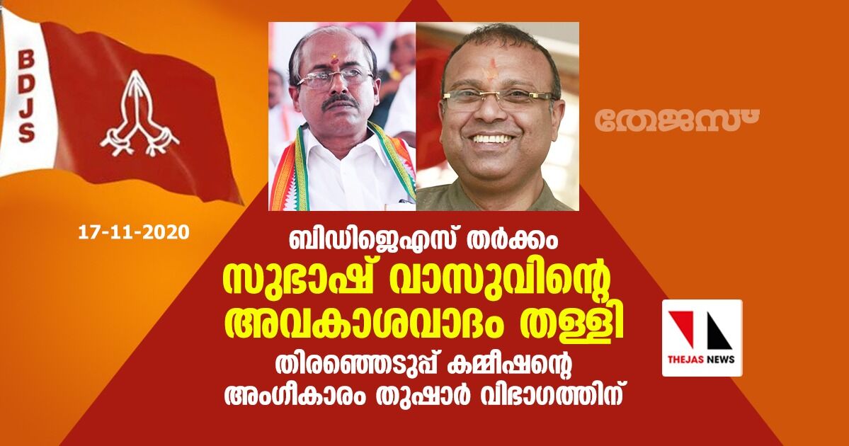 ബിഡിജെഎസ് തര്ക്കം: സുഭാഷ് വാസുവിന്റെ അവകാശവാദം തള്ളി; തിരഞ്ഞെടുപ്പ് കമ്മീഷന്റെ അംഗീകാരം തുഷാര് വിഭാഗത്തിന്