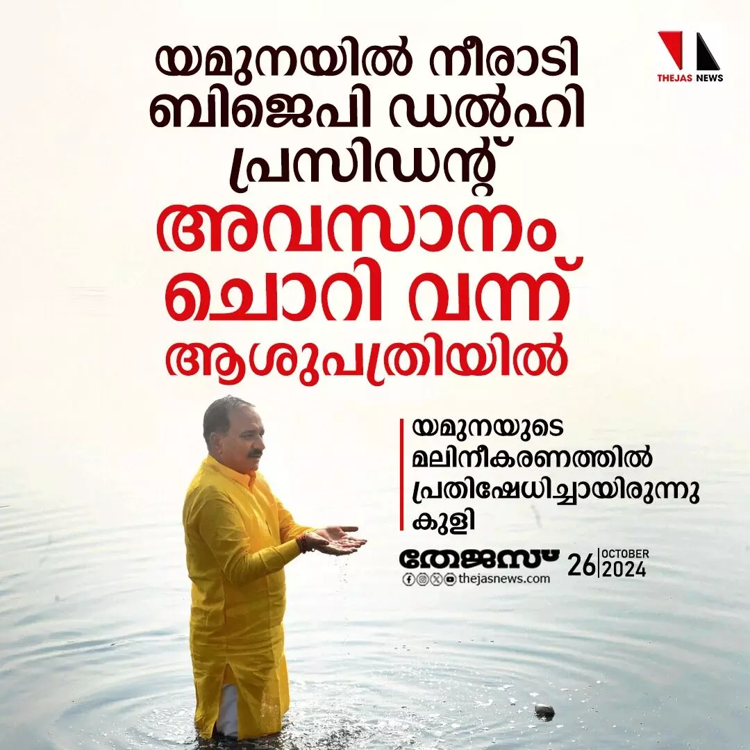 യമുനയില് നീരാടി ബിജെപി ഡല്ഹി പ്രസിഡന്റ്; അവസാനം ചൊറി വന്ന് ആശുപത്രിയില്