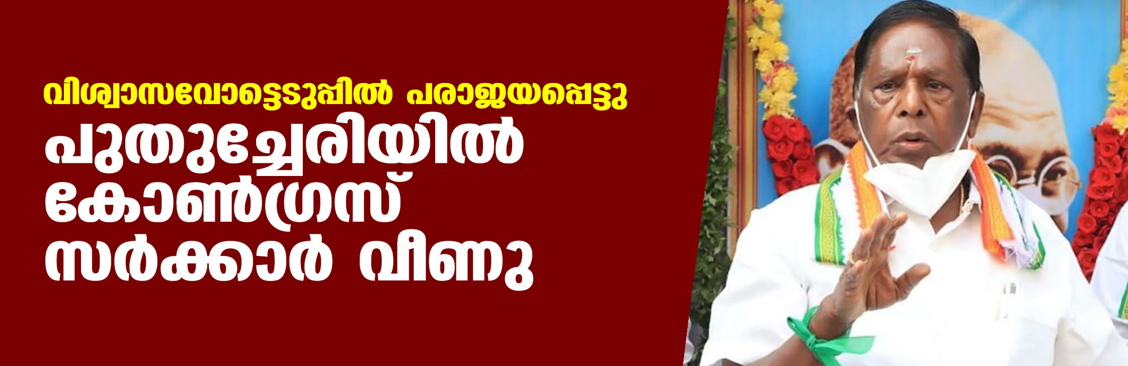 വിശ്വാസ വോട്ടെടുപ്പിന് മുമ്പായി വി നാരായണസ്വാമിയും ഭരണപക്ഷ എംഎല്എമാരും സഭയില്നിന്ന് ഇറങ്ങിപോയി. തുടര്ന്ന് വിശ്വാസം നേടിയെടുക്കുന്നതില് സര്ക്കാര് പരാജയപ്പെട്ടെന്ന് സ്പീക്കര് അറിയിക്കുകയായിരുന്നു. പിന്നീടദ്ദേഹം രാജി സമര്പ്പിക്കുന്നതിനായി ഗവര്ണറെ കാണാന് പോയി. തിരഞ്ഞെടുപ്പിന് രണ്ടുമാസം മാത്രം ബാക്കി നില്ക്കെയാണ് പുതുച്ചേരിയില് കോണ്ഗ്രസ്- ഡിഎംകെ സര്ക്കാരിന് അധികാരം നഷ്ടമാവുന്നത്.