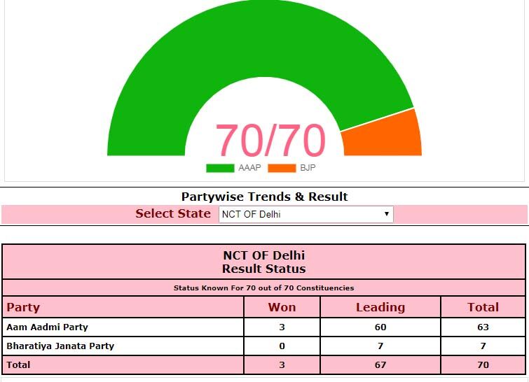 അവസാനഘട്ട ഫലങ്ങള് ലഭിക്കുമ്പോള് വോട്ടെടുപ്പ് നടന്ന 70 അംഗ നിയമസഭാ സീറ്റില് എഎപി 62 സീറ്റുകളില് മുന്നിട്ടുനില്ക്കുകയാണ്. 70ല് 67 സീറ്റുകളും നേടി 2015ല് നേടിയ അപ്രമാദിത്വവിജയം എഎപിക്ക് ആവര്ത്തിക്കാനുമായില്ല.