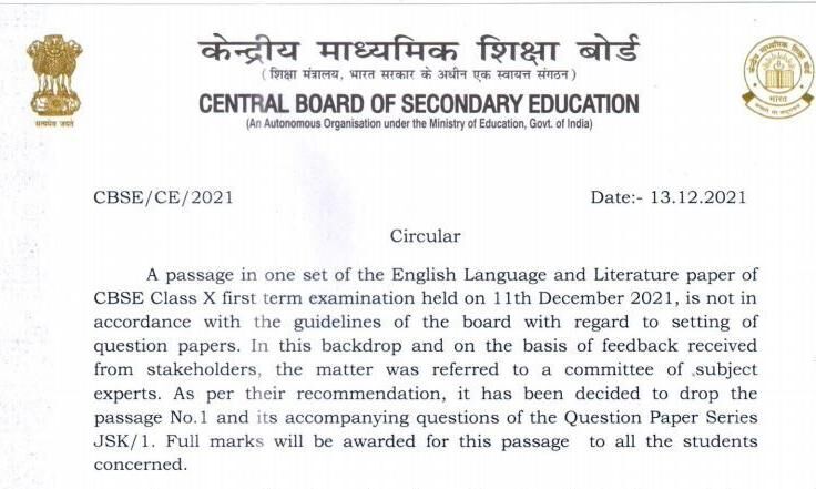 സംഭവം വിവാദമായതിനു പിന്നാലെ ഈ ഭാഗം പരീക്ഷയിൽ നിന്ന് ഒഴിവാക്കിയതായി സിബിഎസ്ഇ അറിയിച്ചു. ഈ ചോദ്യങ്ങൾക്ക് എല്ലാ കുട്ടികൾക്കും മുഴുവൻ മാർക്കും നൽകുമെന്നും സിബിഎസ്ഇ തിങ്കളാഴ്ച അറിയിച്ചു. പിന്തിരിപ്പിൻ ആശയങ്ങളെ പ്രോൽസാഹിപ്പിക്കുന്നതാണ് ചോദ്യ പേപ്പറിലെ പരാമർശങ്ങൾ എന്നു കാണിച്ച് ചില രക്ഷിതാക്കൾ തങ്ങളെ സമീപിച്ചിരുന്നതായും സിബിഎസ്ഇ വ്യക്തമാക്കി. ചോദ്യങ്ങൾ പല വ്യാഖ്യാനങ്ങൾക്കും ഇടയാക്കുമെന്ന് ചൂണ്ടിക്കാണിച്ചാണ് സിബിഎസ്ഇ ഇത് ഒഴിവാക്കിയത്.