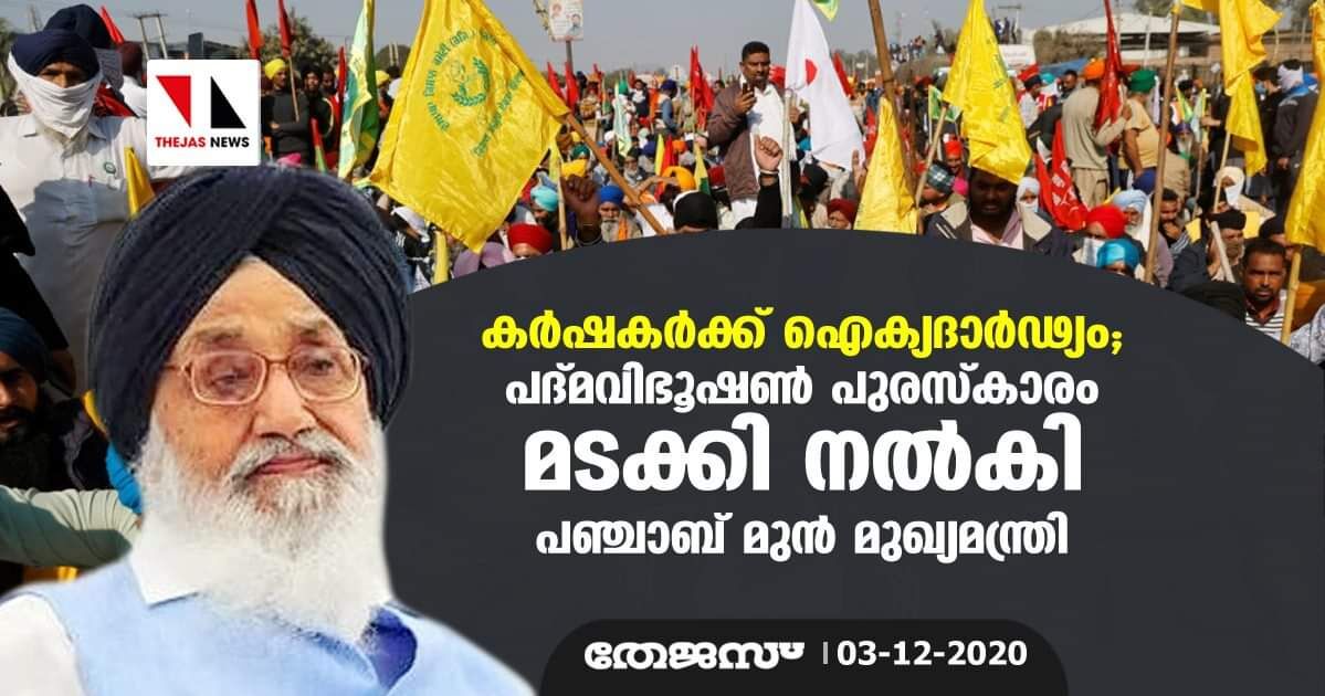 കര്ഷകര്ക്ക് ഐക്യദാര്ഢ്യം; പദ്മവിഭൂഷണ് പുരസ്കാരം മടക്കി നല്കി പഞ്ചാബ് മുന് മുഖ്യമന്ത്രി