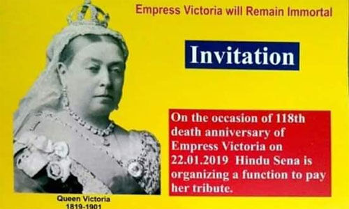 വിക്ടോറിയ രാജ്ഞിയുടെ 118ാം ചരമ വാര്ഷിക ദിനമായ ഇന്നാണ് ഹിന്ദുത്വ സംഘടനയായ ഹിന്ദു സേന രാജ്യ തലസ്ഥാനത്ത് ബ്രിട്ടീഷ് ഭരണത്തെ മഹത്വ വത്കരിച്ച് പരിപാടി നടത്തിയത്.