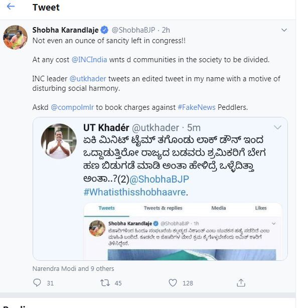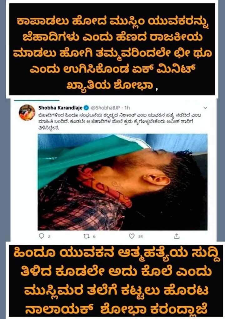 ജിഹാദികള് നിഷാന്ത് എന്ന ഹിന്ദു പ്രവര്ത്തകനെ കൊലപ്പെടുത്തിയെന്നും കുറ്റവാളികള്ക്കെതിരേ നടപടിയെടുക്കാന് അമിത് ഷായോട് അഭ്യര്ഥിച്ചുവെന്നുമുള്ള ട്വീറ്റാണ് എംപിയുടെ പേരില് പ്രചരിച്ചതെന്ന്ഇന്ത്യന് എക്സ്പ്രസ് റിപോര്ട്ട് ചെയ്യുന്നു. വര്ഗീയപരാമര്ശത്തിനെതിരേ സോഷ്യല് മീഡിയകളില് വ്യാപകവിമര്ശനവും പ്രതിഷേധവുമാണ് ഉയര്ന്നത്. വിവാദ ട്വീറ്റിനെതിരേ മംഗളൂരു എംഎല്എ യു ടി ഖാദര് രംഗത്തെത്തുകയും ഇക്കാര്യത്തില് ബിജെപി എംപി വ്യക്തതവരുത്തണമെന്നും ആവശ്യപ്പെട്ടു. ഇതോടെ ഇത്തരത്തില് ട്വീറ്റ് ചെയ്തത് താനല്ലെന്നും ജിഹാദി കോണ്ഗ്രസ് തെറ്റായ വിവരങ്ങള് പ്രചരിപ്പിക്കുകയാണെന്നും വിശദീകരിച്ച് ശോഭാ കരന്തലജെ രംഗത്തെത്തി.