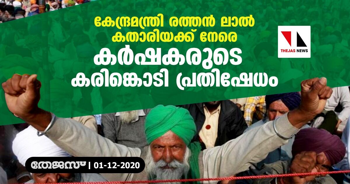 അംബാല: കേന്ദ്രത്തിന്റെ കാർഷിക നിയമങ്ങളിൽ പ്രതിഷേധിച്ച് നൂറിലധികം കർഷകരുടെ സംഘം ചൊവ്വാഴ്ച അംബാല നഗരത്തോട് ചേർന്നുള്ള ജാൻഡ്ലി ഗ്രാമത്തിൽ കേന്ദ്രമന്ത്രി റത്തൻ ലാൽ കതാരിയയ്ക്ക് നേരെ കരിങ്കൊടി കാണിച്ചു. കേന്ദ്ര സഹമന്ത്രി ജൽ ശക്തിയും അംബാല ബിജെപി എംഎൽഎ അസീം ഗോയലും ചില പ്രാദേശിക പാർട്ടി നേതാക്കളും ഒപ്പമുണ്ടായിരുന്നു.