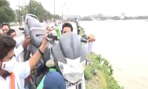 ഹൈദരാബാദ്: ഇന്ധനവില തുടര്ച്ചയായി വര്ധിക്കുന്നതില് പ്രതിഷേധിച്ച് തെലങ്കാനയില് യൂത്ത് കോണ്ഗ്രസ് പ്രവര്ത്തകര് ബൈക്ക് തടാകത്തിലേക്ക് എറിഞ്ഞു. ഇന്ധനവില വര്ധനയ്ക്കെതിരേ രാജ്യത്തുടനീളം പെട്രോള് പമ്പുകള്ക്ക് മുന്നില് രാജ്യവ്യാപകമായി 'പ്രതീകാത്മക പ്രതിഷേധം' നടത്തുമെന്ന് കോണ്ഗ്രസ് പ്രഖ്യാപിച്ചിരുന്നു. പ്രതിഷേധപരിപാടിയുടെ ഭാഗമായാണ് തെലങ്കാനയിലെ ഹുസൈന് സാഗര് തടാകത്തിലേക്ക് ബൈക്ക് എറിഞ്ഞത്. പ്രവര്ത്തകര് ബൈക്ക് തടാകത്തിലിടുന്നതിന്റെ വീഡിയോ ദൃശ്യങ്ങള് സമൂഹമാധ്യമങ്ങളില് വ്യാപകമായി പ്രചരിക്കുന്നുണ്ട്.