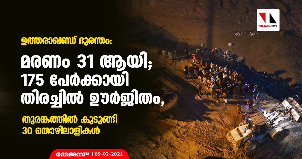 ഉത്തരാഖണ്ഡ് ദുരന്തം: മരണം 31 ആയി; 175 പേര്ക്കായി തിരച്ചില് ഊര്ജിതം, തുരങ്കത്തില് കുടുങ്ങി 30 തൊഴിലാളികള്