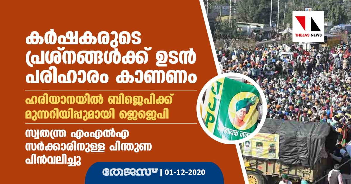 ഡല്ഹിയില് നടക്കുന്ന പ്രതിഷേധം കൂടുതല് ശക്തമായി മുന്നോട്ടുപോയിക്കൊണ്ടിരിക്കുന്ന പശ്ചാത്തലത്തിലാണ് ജെജെപിയുടെ ഇടപെടല്. മനോഹര്ലാല് ഖട്ടാറിന്റെ നേതൃത്വത്തിലുള്ള ഹരിയാന സര്ക്കാര് പോലിസിനെ ഉപയോഗിച്ച് കണ്ണൂര്വാതകയും ജലപീരങ്കിയും ബാരിക്കേഡും തീര്ത്ത് കര്ഷക സമരം അടിച്ചമര്ത്താന് ശ്രമിച്ചതിനെതിരേ വലിയ വിമര്ശനങ്ങള് ഉയരുകയും ചെയ്തിരുന്നു. കാര്ഷിക വിഷയവുമായി ബന്ധപ്പെട്ട് പഞ്ചാബിലെ സഖ്യകക്ഷി അകാലിദള് ബിജെപിയ്ക്കുള്ള പിന്തുണ കഴിഞ്ഞദിവസം പിന്വലിച്ചതും അവര്ക്ക് വലിയ തിരിച്ചടിയായിരിക്കുകയാണ്.