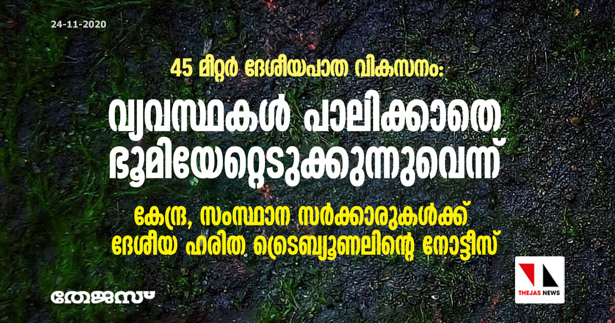 45 മീറ്റര് ദേശീയപാത വികസനം: വ്യവസ്ഥകള് പാലിക്കാതെഭൂമിയേറ്റെടുക്കുന്നുവെന്ന്;കേന്ദ്ര,സംസ്ഥാന സര്ക്കാരുകള്ക്ക് ദേശീയ ഹരിത ട്രൈബ്യൂണലിന്റെ നോട്ടീസ്