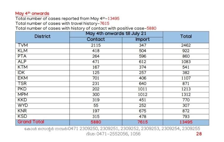 തിരുവനന്തപുരത്തിന് പുറമെ എറണാകുളം ജില്ലയിലും സമ്പർക്ക രോഗബാധിതരുടെ എണ്ണം കുതിച്ചുയരുകയാണ്. 701 സമ്പർക്ക രോഗികളാണ് ഇവിടെയുള്ളത്. 471 രോഗികളുള്ള ആലപ്പുഴയും 418 രോഗികളുള്ള കൊല്ലവുമാണ് യഥാക്രമം മൂന്നും നാലും സ്ഥാനത്ത്. വയനാട് ജില്ലയിലാണ് ഏറ്റവും കുറവ് സമ്പർക്ക വൈറസ് ബാധിതർ. 55 പേർക്ക് മാത്രമാണ് ഇതുവരെ ഇവിടെ രോഗം സ്ഥിരീകരിച്ചിട്ടുള്ളത്.