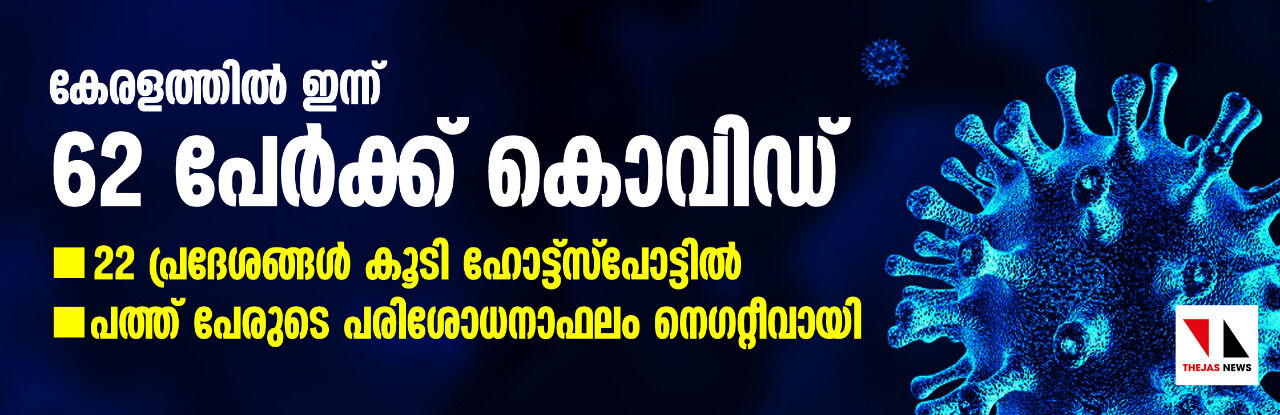 സംസ്ഥാനത്ത് 62 പേര്ക്ക് കൂടി കൊവിഡ്; പത്തുപേർ രോഗമുക്തരായി