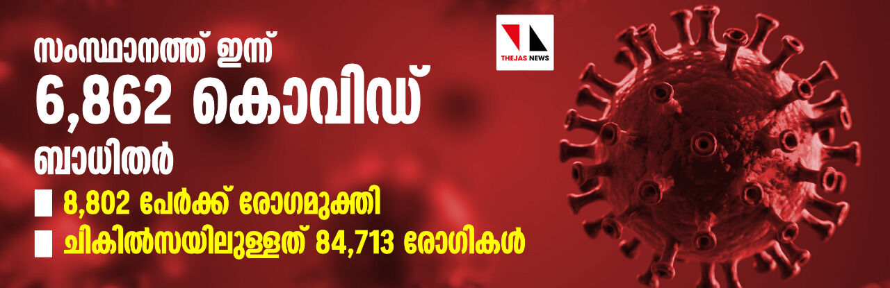 സംസ്ഥാനത്ത് ഇന്ന് 6,862 കൊവിഡ് ബാധിതര്; 8,802 പേര്ക്ക് രോഗമുക്തി, ചികില്സയിലുള്ളത് 84,713 രോഗികള്