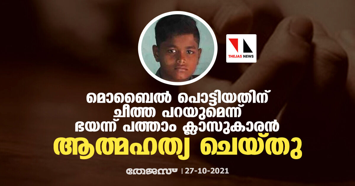 മൊബൈൽ പൊട്ടിയതിന് ചീത്ത പറയുമെന്ന് ഭയന്ന് പത്താം ക്ലാസുകാരൻ ആത്മഹത്യ ചെയ്തു