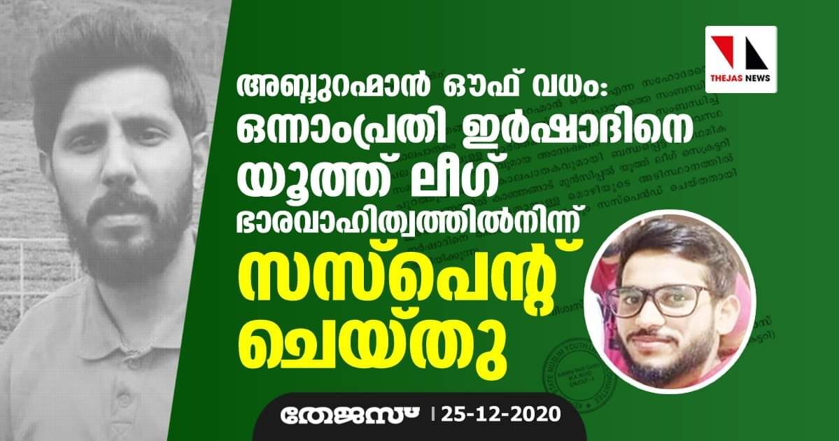 അബ്ദുറഹ്മാന് ഔഫ് വധം: ഒന്നാം പ്രതി ഇര്ഷാദിനെ യൂത്ത് ലീഗ് ഭാരവാഹിത്വത്തില്നിന്ന് സസ്പെന്റ് ചെയ്തു