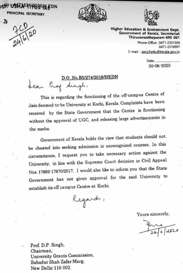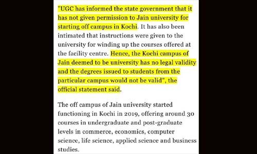കൊച്ചിയില് ഓഫ് കാംപസിന് അനുമതി നല്കിയിട്ടില്ലെന്നും അവിടെ നടത്തുന്ന കോഴ്സുകള് അവസാനിപ്പിക്കാന് നിര്ദേശം നല്കിയതായും യുജിസി അറിയിച്ചിട്ടുണ്ട്. ജയിന് യൂനിവേഴ്സിറ്റിയുടെ കൊച്ചി ഓഫ് കാംപസിന് യാതൊരു നിയമസാധുതയുമില്ല. കൊച്ചി കാംപസില് പഠിച്ചവര്ക്ക് നല്കുന്ന ബിരുദവും സാധുവല്ലെന്നും ഉന്നതവിദ്യാഭ്യാസ വകുപ്പ് വ്യക്തമാക്കിയിരുന്നതാണ്. ഇതൊന്നും മുഖവിലയ്ക്കെടുക്കാതെ കാംപസിന്റെ പ്രവര്ത്തനം തുടരുന്നതിനെതിരേ വീണ്ടും സംസ്ഥാന ഉന്നത വിദ്യാഭ്യാസ വകുപ്പിന്റെ ഇടപെടലുണ്ടായി. കഴിഞ്ഞമാസം 20നാണ് ഉന്നത വിദ്യാഭ്യാസ വകുപ്പ് പ്രിന്സിപ്പല് സെക്രട്ടറി ഉഷാ റ്റൈറ്റസ് യൂനിവേഴ്സിറ്റിക്കെതിരേ നടപടിയാവശ്യപ്പെട്ട് യുജിസിക്ക് കത്ത് നല്കിയത്.