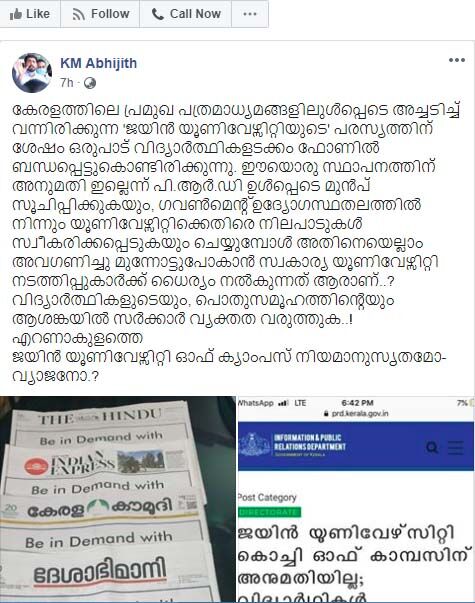 ഈ സ്ഥാപനത്തിന് അനുമതിയില്ലെന്ന് പിആര്ഡി ഉള്പ്പെടെ മുമ്പ് സൂചിപ്പിക്കുകയും സര്ക്കാര് ഉദ്യോഗസ്ഥതലത്തില്നിന്നും യൂനിവേഴ്സിറ്റിക്കെതിരേ നിലപാടുകള് സ്വീകരിക്കപ്പെടുകയും ചെയ്യുമ്പോള് അതിനെയെല്ലാം അവഗണിച്ച് മുന്നോട്ടുപോവാന് സ്വകാര്യ യൂനിവേഴ്സിറ്റി നടത്തിപ്പുകാര്ക്ക് ധൈര്യം നല്കുന്നത് ആരാണ്. ജയിന് യൂനിവേഴ്സിറ്റി ഓഫ് കാംപസ് നിയമാനുസൃതമോ, വ്യാജനോ എന്ന് സര്ക്കാര് മറുപടി പറയണമെന്നും കെഎസ്യു ആവശ്യപ്പെടുന്നു.