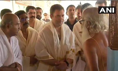 കണ്ണൂര്, കാസര്കോട്, വടകര മണ്ഡലത്തിലെ നേതാക്കളുമായുള്ള കൂടിക്കാഴ്ചയില് പങ്കെടുത്ത രാഹുല് വയനാട്ടിലെ പ്രചാരണത്തിന്റെ ഭാഗമായി പിതാവ് രാജീവ് ഗാന്ധിയുടെ ചിതാഭസ്മം നിമഞ്ജനം ചെയ്ത തിരുനെല്ലിയില് ക്ഷേത്രദര്ശനം നടത്താനെത്തി. പാപനാശിനിയില് ബലിതര്പ്പണത്തിനായാണ് രാഹുല് ഇവിടെ എത്തിയത്. തിരുനെല്ലി ക്ഷേത്രത്തിന് ഒരു കിലോമീറ്റര് അകലെ തയ്യാറാക്കിയ ഹെലിപാഡില് ഇറങ്ങിയശേഷമാണ് രാഹുല് ക്ഷേത്രത്തിലേക്ക് തിരിച്ചത്. മുന് മുഖ്യമന്ത്രി ഉമ്മന്ചാണ്ടി, എഐസിസി ജനറല് സെക്രട്ടറിമാരായ കെ സി വേണുഗോപാല്, മുകുള് വാസ്നിക്, കെപിസിസി പ്രസിഡന്റ് മുല്ലപ്പള്ളി രാമചന്ദ്രന് തുടങ്ങിയവരും ഒപ്പമുണ്ട്. അരമണിക്കൂറോളം രാഹുല് ഗാന്ധി ഇവിടെ ചെലവഴിക്കും.