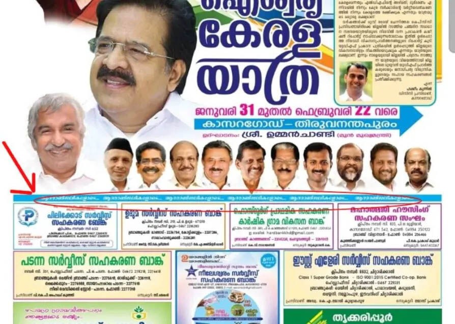 തിരൂരില് കോണ്ഗ്രസ് ഓഫിസ് ഉദ്ഘാടനത്തിനെത്തിയ മുന് മുഖ്യമന്ത്രി ഉമ്മന്ചാണ്ടി ഐശ്വര്യകേരള യാത്രയ്ക്ക് 'ആദരാഞ്ജലികള്' അര്പ്പിച്ച വീക്ഷണം പത്രത്തിലെ പരസ്യം നോക്കിക്കാണുന്നു