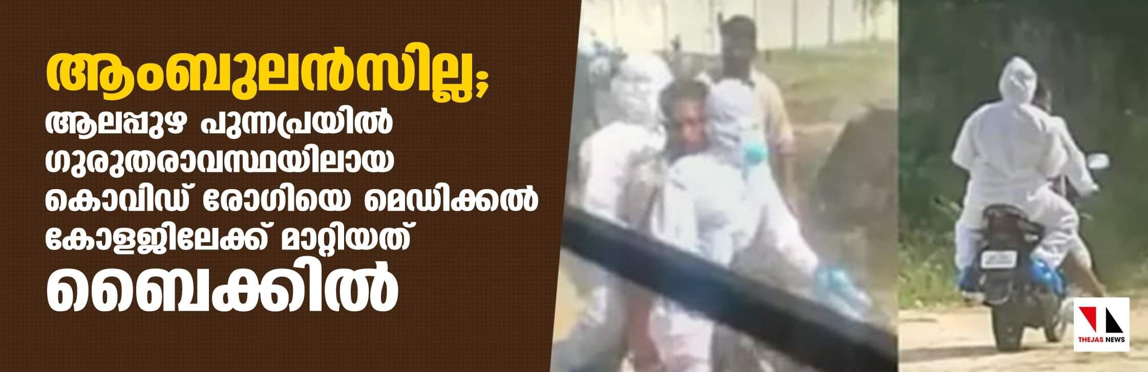 ആംബുലന്സില്ല;ആലപ്പുഴ പുന്നപ്രയില് ഗുരുതരാവസ്ഥയിലായ കൊവിഡ് രോഗിയെ മെഡിക്കല് കോളജിലേക്ക് മാറ്റിയത് ബൈക്കില്