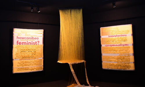 ലോകമേ തറവാട് കലാ പ്രദര്ശനം: കൈത്തറിയില് നെയ്തെടുത്ത കലാസൃഷ്ടിയുമായി ലക്ഷ്മി മാധവന്