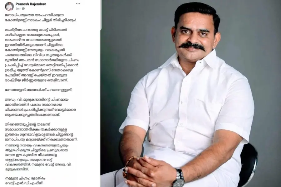 എല്ഡിഎഫ് സ്ഥാനാര്ഥി വി. മുരുകദാസിന്റെ ചിഹ്നമായ 'മോതിരത്തിന്' വോട്ട് ചെയ്യണമെന്നും വികസനത്തിന്റെ തുടര്ച്ചയ്ക്കായി എല്ഡിഎഫിന് വോട്ട് നല്കണമെന്നും പോസ്റ്റില് ആഹ്വാനം ചെയ്യുന്നു. കൂടാതെ, യുഡിഎഫ് മണ്ഡലത്തില് തരംതാഴ്ന്ന രാഷ്ട്രീയ പ്രവര്ത്തനമാണ് നടത്തുന്നതെന്നും ജനാധിപത്യത്തെ പരിഹസിക്കുന്ന കോണ്ഗ്രസ് നാടകത്തിന് ചിറ്റൂര് മറുപടി നല്കുമെന്നും പോസ്റ്റില് പരാമര്ശമുണ്ട്.