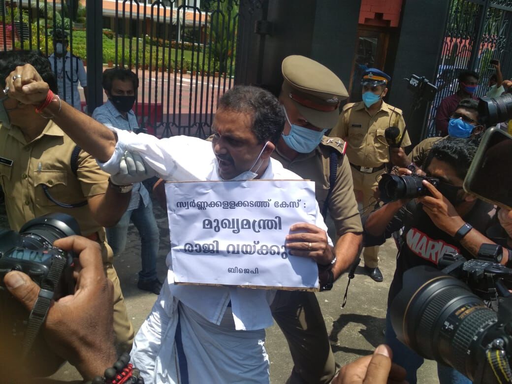 തിരുവനന്തപുരം: സ്വർണ്ണക്കള്ളക്കടത്ത് മുഖ്യമന്ത്രി രാജിവെക്കണമെന്നാവശ്യപ്പെട്ട് നിയമസഭയ്ക്ക് മുമ്പിൽ പ്രതിഷേധിച്ച ബിജെപി സംസ്ഥാന അദ്ധ്യക്ഷൻ കെ സുരേന്ദ്രൻ ഉൾപ്പെടെയുള്ള ബിജെപി നേതാക്കളെ പോലിസ് അറസ്റ്റ് ചെയ്തു. ദേശവിരുദ്ധർക്ക് താവളമൊരുക്കിയ മുഖ്യമന്ത്രി രാജിവെക്കും വരെ ബിജെപി പ്രതിഷേധം തുടരുമെന്ന് സുരേന്ദ്രൻ പറഞ്ഞു. കള്ളക്കടത്തു പണംപോയത് എകെജി സെൻററിലേക്കും മുഖ്യമന്ത്രിയിലേക്കുമാണ്. തിരുവനന്തപുരം വിമാനത്താവള വികസനത്തിനെതിരായ പ്രമേയ ചർച്ചയിൽ ഒ രാജഗോപാൽ എംഎൽഎയെ സംസാരിക്കാൻ അനുവദിക്കാതിരുന്നത് ജനാധിപത്യവിരുദ്ധമാണെന്ന് അദ്ദേഹം ആരോപിച്ചു. പ്രതിഷേധം ഒ രാജഗോപാൽ എംഎൽഎ ഉദ്ഘാടനം ചെയ്തു. പ്രതിഷേധത്തിന് ശേഷം രാജഗോപാൽ നിയമസഭയിലേക്ക് പോയതിന് ശേഷം നേതാക്കൾ സഭാ കവാടത്തിന് മുന്നിൽ കുത്തിയിരുന്ന് പ്രതിഷേധിക്കാൻ ശ്രമിച്ചതോടെയാണ് അറസ്റ്റ് നടത്തിയത്. സംസ്ഥാന ജനറൽ സെക്രട്ടറിമാരായ ജോർജ് കുര്യൻ, പി സുധീർ, വൈസ് പ്രസിഡൻ്റ് വി ടി രമ, സെക്രട്ടറിമാരായ എസ് സുരേഷ്, സി ശിവൻകുട്ടി, വി വി രാജേഷ് എന്നിവരെയാണ് അറസ്റ്റ് ചെയ്തത്.