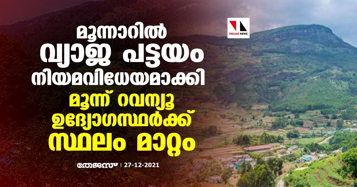 മൂന്നാറിൽ വ്യാജ പട്ടയം നിയമവിധേയമാക്കി; മൂന്ന് റവന്യൂ ഉദ്യോഗസ്ഥര്ക്ക് സ്ഥലം മാറ്റം