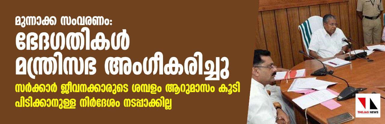 ഇത് കൂടാതെ കൊവിഡ് മൂലമുള്ള സാമ്പത്തിക പ്രതിസന്ധി നേരിടുന്നതിന് സർക്കാർ ജീവനക്കാരുടെ ശമ്പളം ആറുമാസം കൂടി പിടിക്കാനുള്ള നിർദേശം നടപ്പാക്കേണ്ടെന്ന് മന്ത്രിസഭാ യോഗം തീരുമാനിച്ചു. നേരത്തെ സാലറി കട്ടിന്റെ ഭാഗമായി പിടിച്ച ശമ്പളം പിഎഫിൽ ലയിപ്പിക്കും. ഒരുമാസത്തെ ശമ്പളമാണ് സർക്കാർ ജീവനക്കാരിൽ നിന്ന് പിടിച്ചത്. ഇങ്ങനെ പി.എഫില് ലയിപ്പിക്കുന്ന തുക 2021 ജൂണ് ഒന്നിനു ശേഷം പിന്വലിക്കാന് അനുമതി നല്കും. പി.എഫില് ലയിപ്പിക്കുന്ന തീയതി മുതല് പി.എഫ് നിരക്കില് പലിശ നല്കാനും തീരുമാനിച്ചിട്ടുണ്ട്. പെന്ഷന്കാരുള്പ്പെടെ പി.എഫ് ഇല്ലാത്തവര്ക്ക് 2021 ജൂണ് ഒന്നു മുതല് ഓരോ മാസത്തേയും തുക തുല്യ തവണകളായി നല്കുന്നതാണ്.