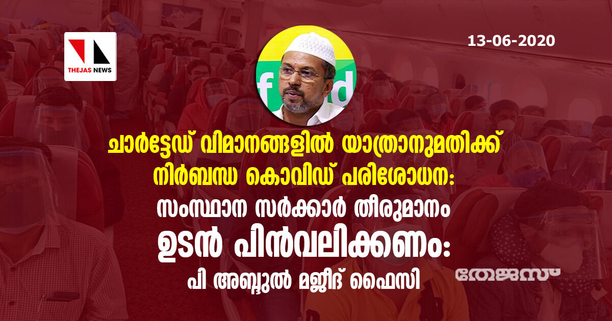 ചാര്ട്ടേഡ് വിമാനങ്ങളില് യാത്രാനുമതിക്ക് നിര്ബന്ധ കൊവിഡ് പരിശോധന; സര്ക്കാര് തീരുമാനം ഉടന് പിന്വലിക്കണം: പി അബ്ദുല് മജീദ് ഫൈസി