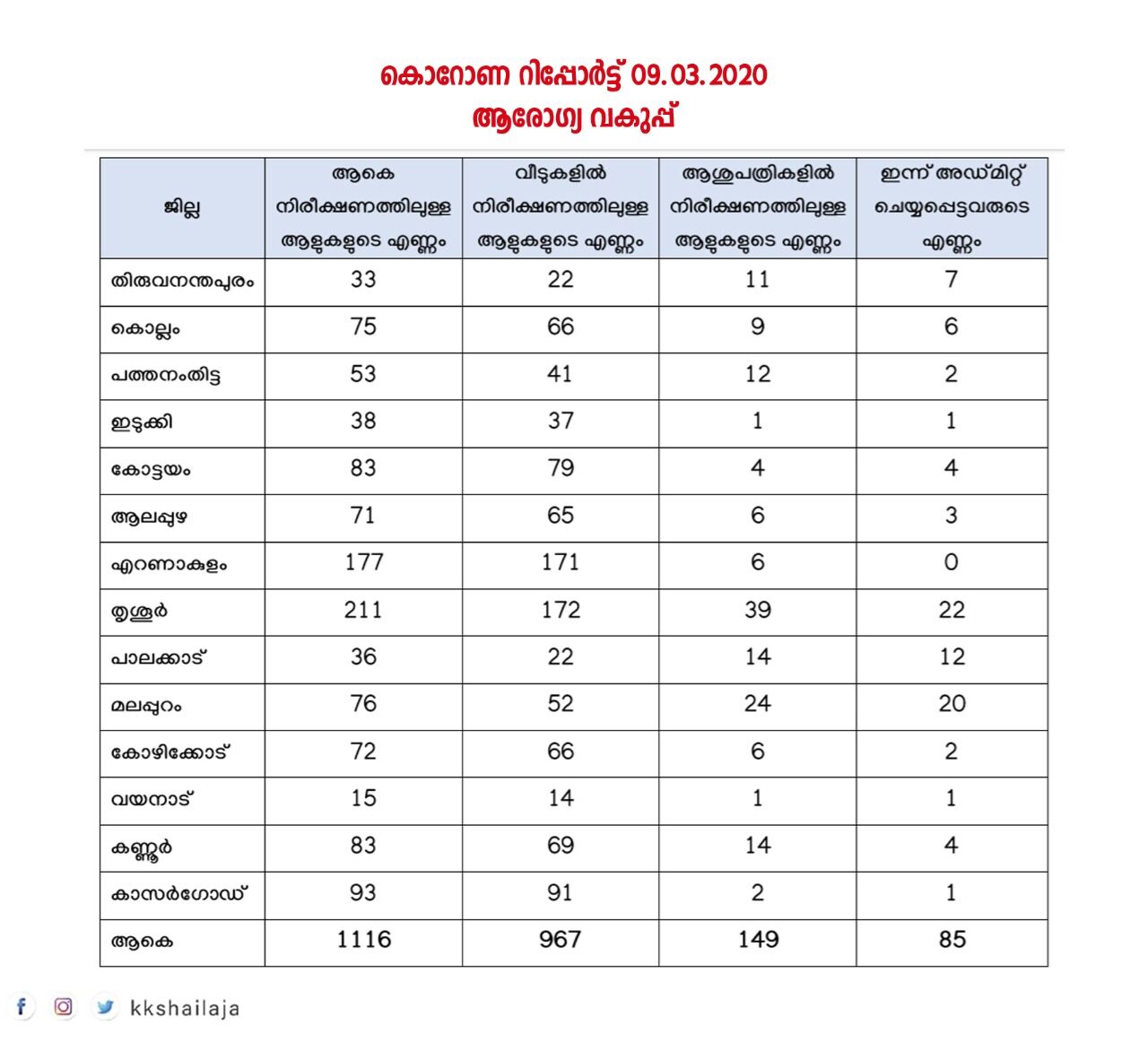 വിവിധ ജില്ലകളിലായി 1116 പേർ നിരീക്ഷണത്തിലാണ്. ഇവരിൽ 967 പേർ വീടുകളിലും 149 പേർ ആശുപത്രികളിലും നിരീക്ഷണത്തിലാണ്. രോഗം സംശയിക്കുന്ന 807 സാമ്പിളുകൾ എൻ. ഐ.വി യിൽ പരിശോധനയ്ക്ക് അയച്ചതിൽ 717 സാമ്പിളുകളുടെ പരിശോധനാ ഫലം നെഗറ്റിവ് ആണ്. ബാക്കിയുള്ള പരിശോധനാഫലം വരാനുണ്ട്. വീട്ടിലെ നിരീക്ഷണത്തിൽ കഴിയുന്ന അഞ്ച് വ്യക്തികളെ പരിഷ്കരിച്ച മാർഗരേഖ പ്രകാരം ഒഴിവാക്കിയിട്ടുണ്ട്.