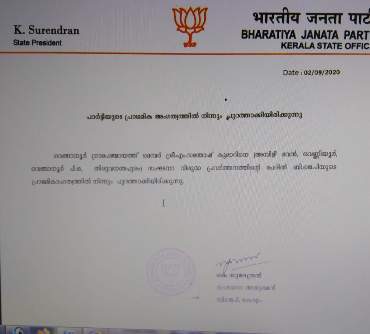 എന്നാൽ സന്തോഷകുമാറിനെ സംഘടനാ വിരുദ്ധ പ്രവർത്തനത്തിന് ബിജെപി സംസ്ഥാന അധ്യക്ഷൻ പ്രാഥമിക അംഗത്വത്തിൽ നിന്നും പുറത്താക്കിയതായി ബിജെപി നേതൃത്വം വ്യക്തമാക്കി