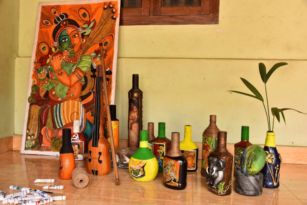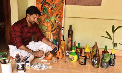 സൗദി അറേബ്യയില് ജോലി ചെയ്യുകയായിരുന്ന ഇദ്ദേഹം മാസങ്ങള്ക്ക് മുന്പാണ് നാട്ടിലെത്തിയത്. മെയ് 25ന് അവധി തീരുമെങ്കിലും തിരിച്ചു പോകാന് ആവുമോ എന്ന് അറിയില്ല. എങ്കിലും ലോക്ക് ഡൗണ് കാലത്തെ വിരസത മാറ്റാന് ജിബീഷ് ആശ്രയിച്ചത് കുപ്പികളെയും പെയിന്റിനെയുമാണ്.