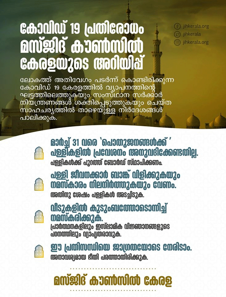 പൊതുജനങ്ങള്ക്ക് പ്രവേശനത്തിന് നിയന്ത്രണം ഏര്പ്പെടുത്തിയത് അറിയിച്ച് പള്ളികള്ക്ക് മുന്നില് ബോര്ഡുകള് സ്ഥാപിക്കാനും മസ്ജിദ് കൗണ്സില് നിര്ദേശം നല്കി. ജീവനക്കാര് നമസ്കാരം നിര്വഹിച്ചാലുടന് പള്ളികള് അടച്ചിടും. അനാവശ്യ ഭീതി പരത്തരുതെന്നും പ്രതിസന്ധിയെ ജാഗ്രതയോടെ നേരിടണമെന്നും മസ്ജിദ് കൗണ്സില് കേരള അറിയിച്ചു.