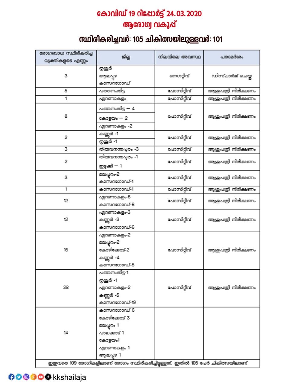 ഇതോടെ കേരളത്തില് 109 പേര്ക്കാണ് ഇതുവരെ രോഗബാധ സ്ഥിരീകരിച്ചത്. അതില് 3 പേര് ആദ്യഘട്ടത്തില് രോഗമുക്തി നേടിയിരുന്നു. കൂടാതെ കണ്ണൂര് ജില്ലയില് ചികിത്സയില് ആയിരുന്ന ഒരാളെ ഡിസ്ചാര്ജ് ചെയ്തു. ഇതോടെ നിലവില് 105 പേരാണ് രോഗം സ്ഥിരീകരിച്ച് വിവിധ ആശുപത്രികളില് ചികിത്സയിലുള്ളത്.