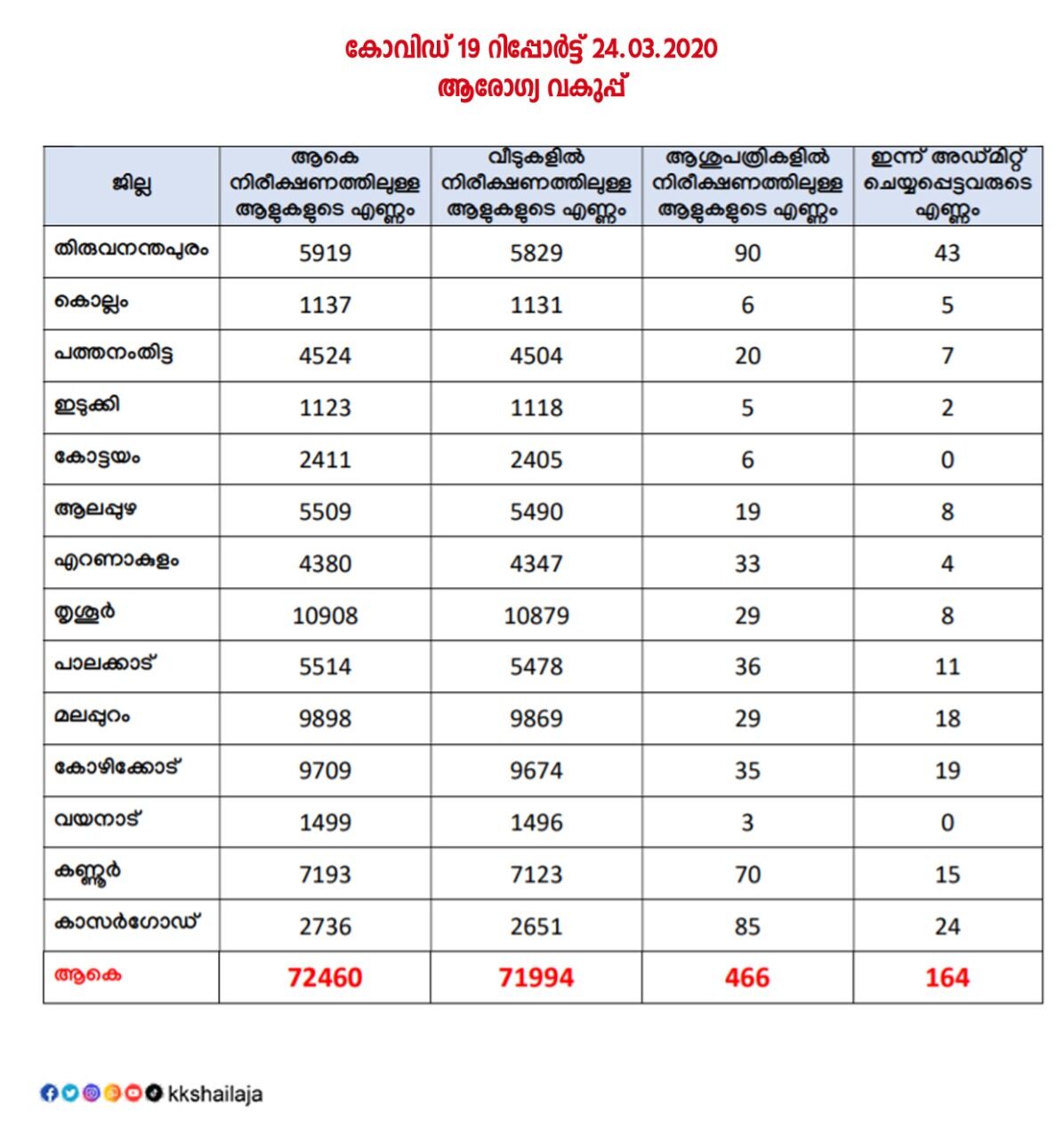 186 ലോക രാജ്യങ്ങളില് കോവിഡ് 19 പടര്ന്നു പിടിച്ച സാഹചര്യത്തിലും കേരളത്തില് രോഗം സ്ഥിരീകരിച്ച സാഹചര്യത്തിലും സംസ്ഥാനത്തെ വിവിധ ജില്ലകളിലായി 72,460 പേര് നിരീക്ഷണത്തിലാണ്. ഇവരില് 71,994 പേര് വീടുകളിലും 466 പേര് ആശുപത്രികളിലും നിരീക്ഷണത്തിലാണ്. 164 പേരെയാണ് ഇന്ന് ആശുപത്രികളില് അഡ്മിറ്റാക്കിയത്. 13,326 പേരെ ഇന്ന് നിരീക്ഷണത്തില് നിന്നും ഒഴിവാക്കി. വാർത്താ സമ്മേളനത്തില് ആരോഗ്യ വകുപ്പ് മന്ത്രി കെ.കെ. ശൈലജ പങ്കെടുത്തു.