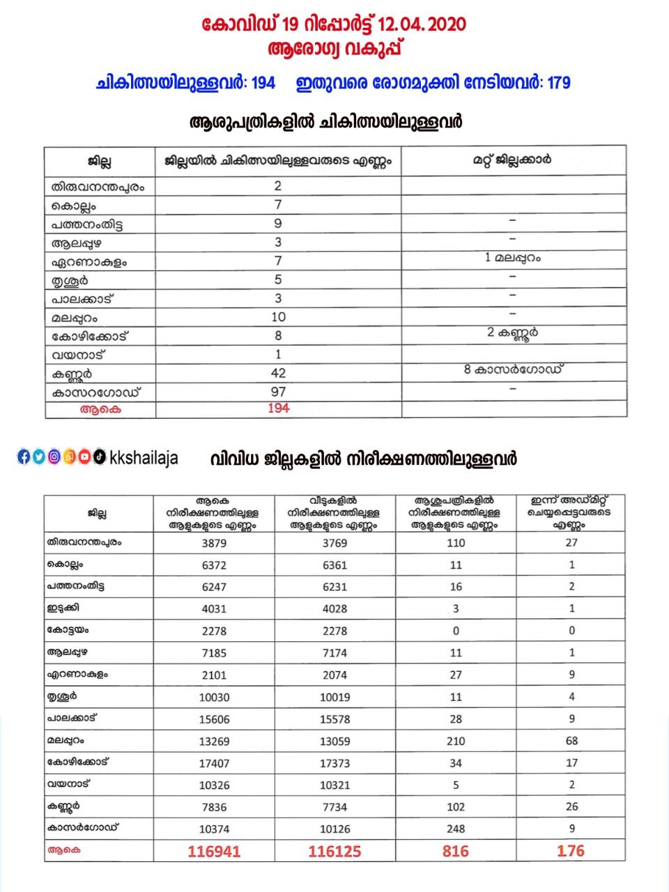 നിലവില് 194 പേരാണ് സംസ്ഥാനത്തെ വിവിധ ആശുപത്രികളില് ചികിത്സയിലുള്ളത്. 179 പേരാണ് ഇതുവരെ കോവിഡില് നിന്നും രോഗമുക്തി നേടിയത്.