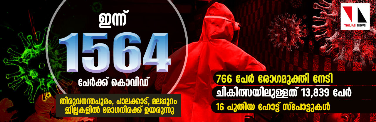 സംസ്ഥാനത്ത് 1564 പേര്ക്ക് കൂടി കൊവിഡ്; തിരുവനന്തപുരം, പാലക്കാട്, മലപ്പുറം ജില്ലകളിൽ രോഗനിരക്ക് ഉയരുന്നു