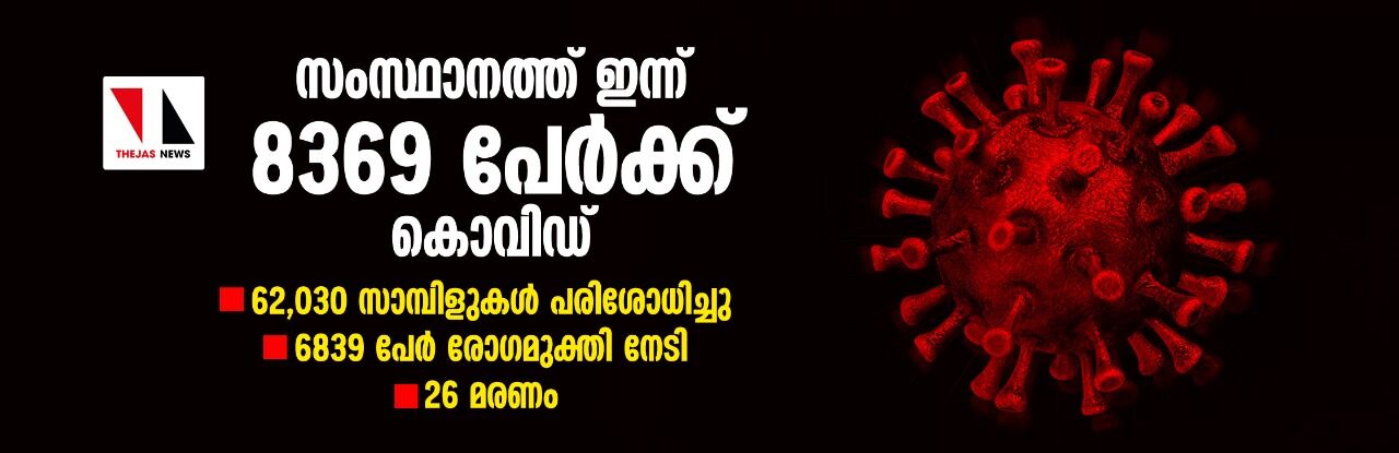 സംസ്ഥാനത്ത് ഇന്ന് 8369 പേര്ക്ക് കൊവിഡ്; 62,030 സാമ്പിളുകള് പരിശോധിച്ചു, 6839 പേര് രോഗമുക്തി നേടി