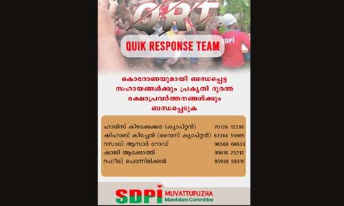 കൊവിഡ്, മഴക്കെടുതി, തുടങ്ങി എന്ത് ദുരിതത്തിലും എന്താവശ്യങ്ങള്ക്കും നാട്ടുകാര്ക്ക് ബന്ധപ്പെടാമെന്നും എത് സമയത്തും പ്രവര്ത്തകര് സജ്ജമാണെന്നും എസ്ഡിപിഐ മുവാറ്റുപുഴ മണ്ഡലം പ്രസിഡന്റ് ഹാരിസ് കിഴക്കേക്കര, സെക്രട്ടറി ഇബ്റാഹിം ചിറയ്ക്കല് എന്നിവര് അറിയിച്ചു.