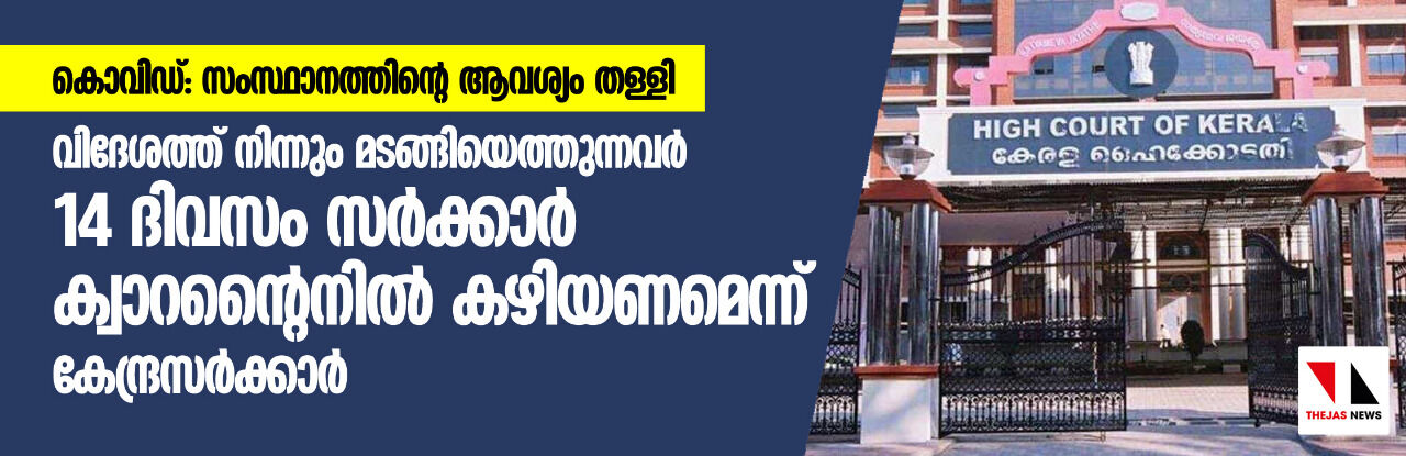 കൊവിഡ്: സംസ്ഥാനത്തിന്റെ ആവശ്യം തള്ളി;വിദേശത്ത് നിന്നും മടങ്ങിയെത്തുന്നവര് 14 ദിവസം സര്ക്കാര് ക്വാറന്റൈനില് കഴിയണമെന്ന് കേന്ദ്രസര്ക്കാര്