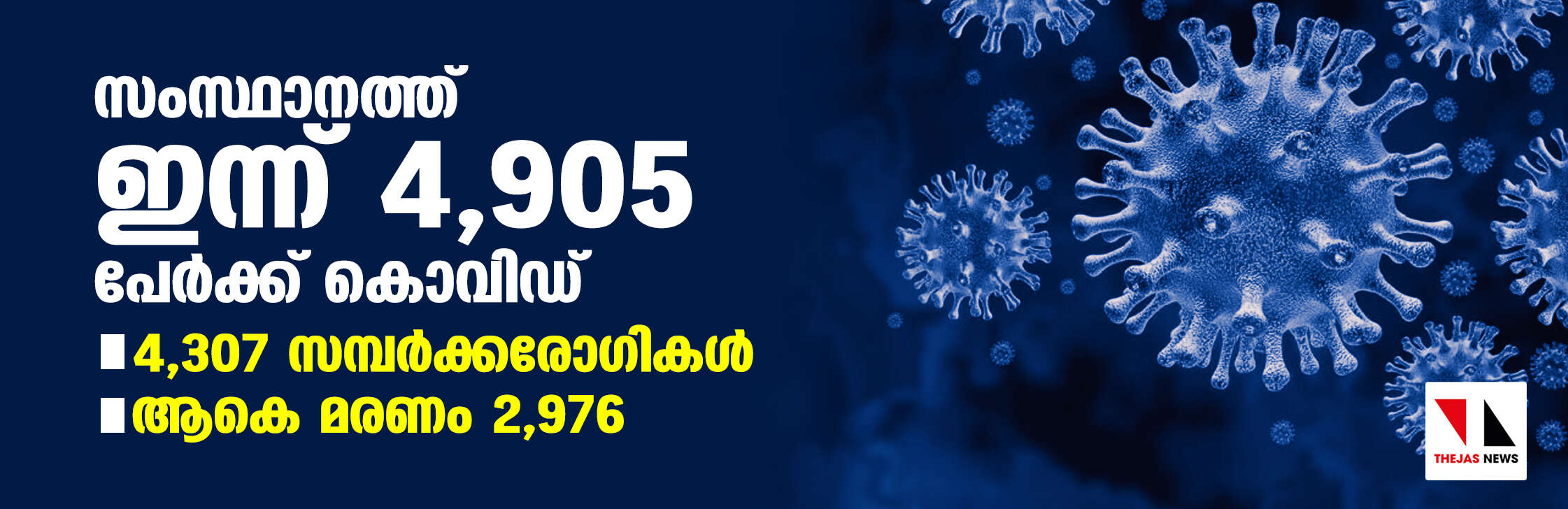 സംസ്ഥാനത്ത് ഇന്ന് 4,905 പേര്ക്ക് കൊവിഡ്; 4,307 സമ്പര്ക്കരോഗികള്, ആകെ മരണം 2,976