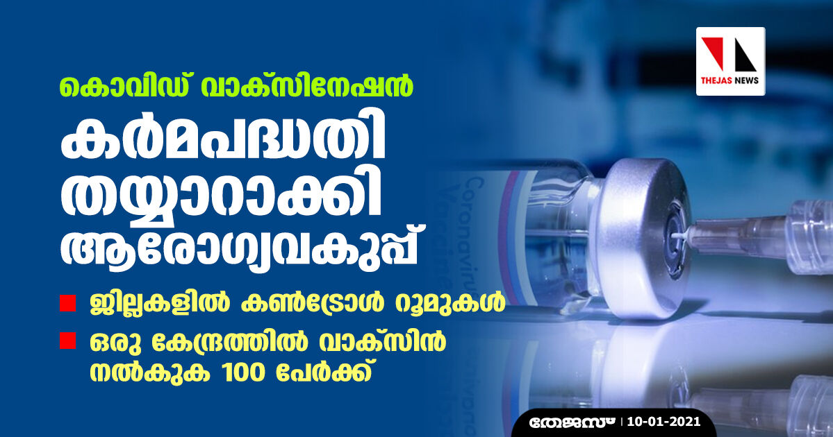 കൊവിഡ് വാക്സിനേഷന്: കര്മപദ്ധതി തയ്യാറാക്കി ആരോഗ്യവകുപ്പ്; ജില്ലകളില് കണ്ട്രോള് റൂമുകള്; ഒരു കേന്ദ്രത്തില് വാക്സിന് നല്കുക 100 പേര്ക്ക്