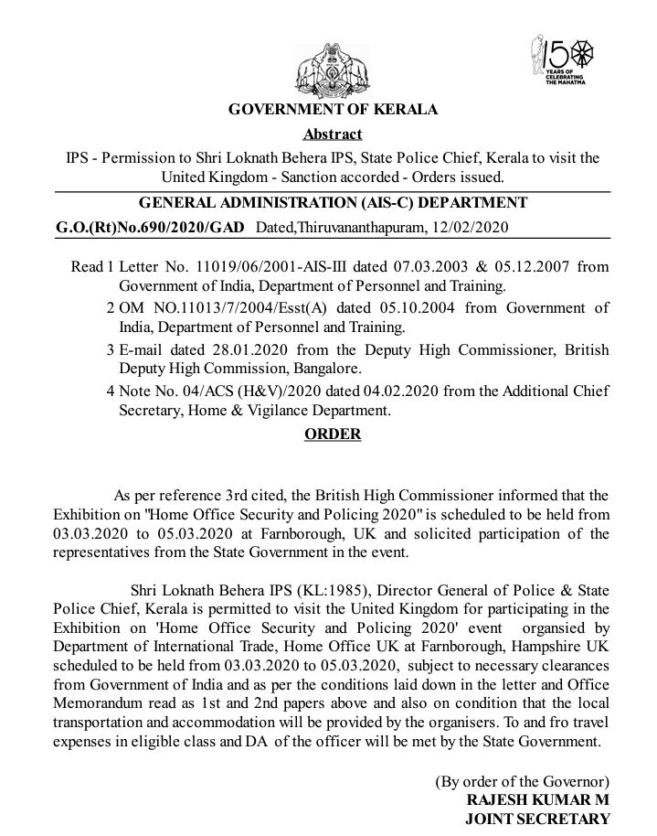 തിരുവനന്തപുരം: റൈഫിളുകളും വെടിയുണ്ടകളും കാണാതായ വിവാദങ്ങൾക്കിടെ പോലിസ് മേധാവി ലോക്നാഥ് ബെഹ്റയ്ക്ക് വിദേശയാത്രാ അനുമതി. ബ്രിട്ടനിലേക്കാണ് ഡിജിപി ലോക്നാഥ് ബെഹ്റ പോകുന്നത്. സുരക്ഷാ സെമിനാറിൽ പങ്കെടുക്കാനാണ് യാത്ര. സർക്കാരാണ് പോലീസ് മേധാവിയുടെ യാത്രാച്ചെലവ് വഹിക്കുന്നത്. മാർച്ച് മൂന്ന്, നാല്, അഞ്ച് തീയതികളിലാണ് ബെഹ്റ ബ്രിട്ടനിലേക്ക് പറക്കുന്നത്.
